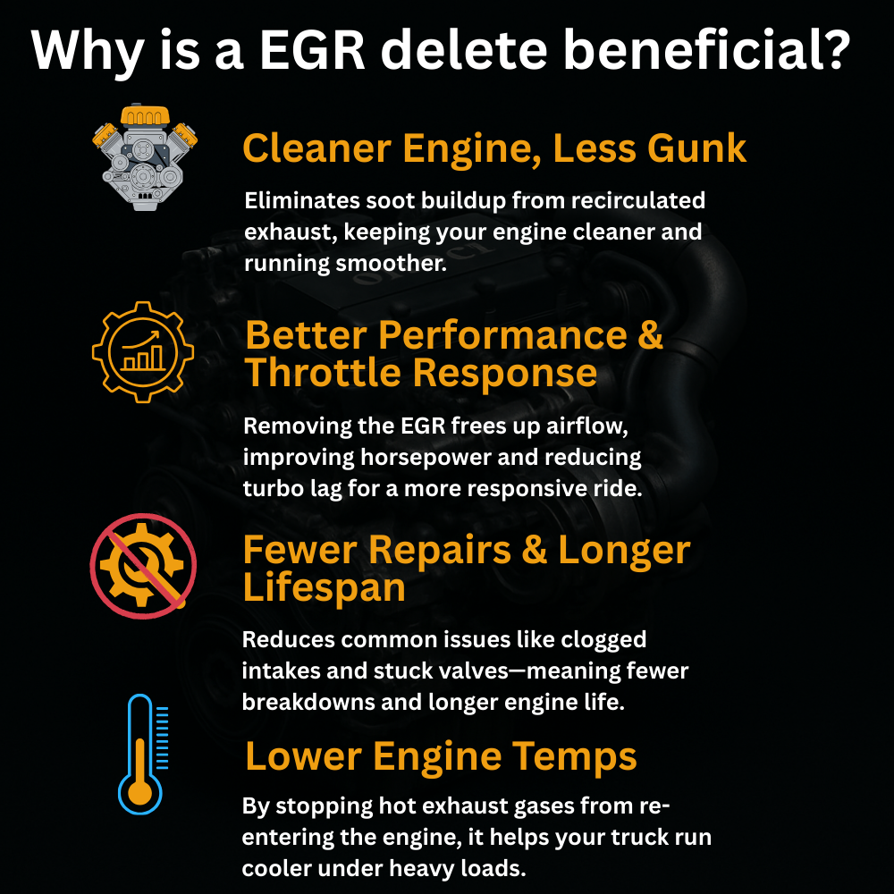 Deleting the EGR system helps prevent carbon buildup, lowers engine temperatures, improves fuel economy, increases reliability, and restores lost power.