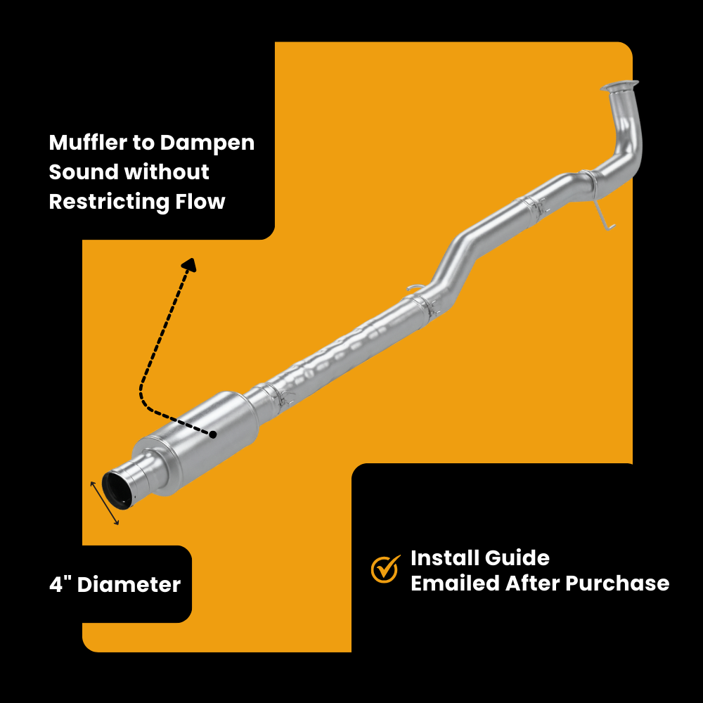 Deleting the DPF will make the exhaust louder. You’ll hear more turbo spool, engine tone, and exhaust note, especially with a straight pipe. We offer optional mufflers for those who want a quieter ride.