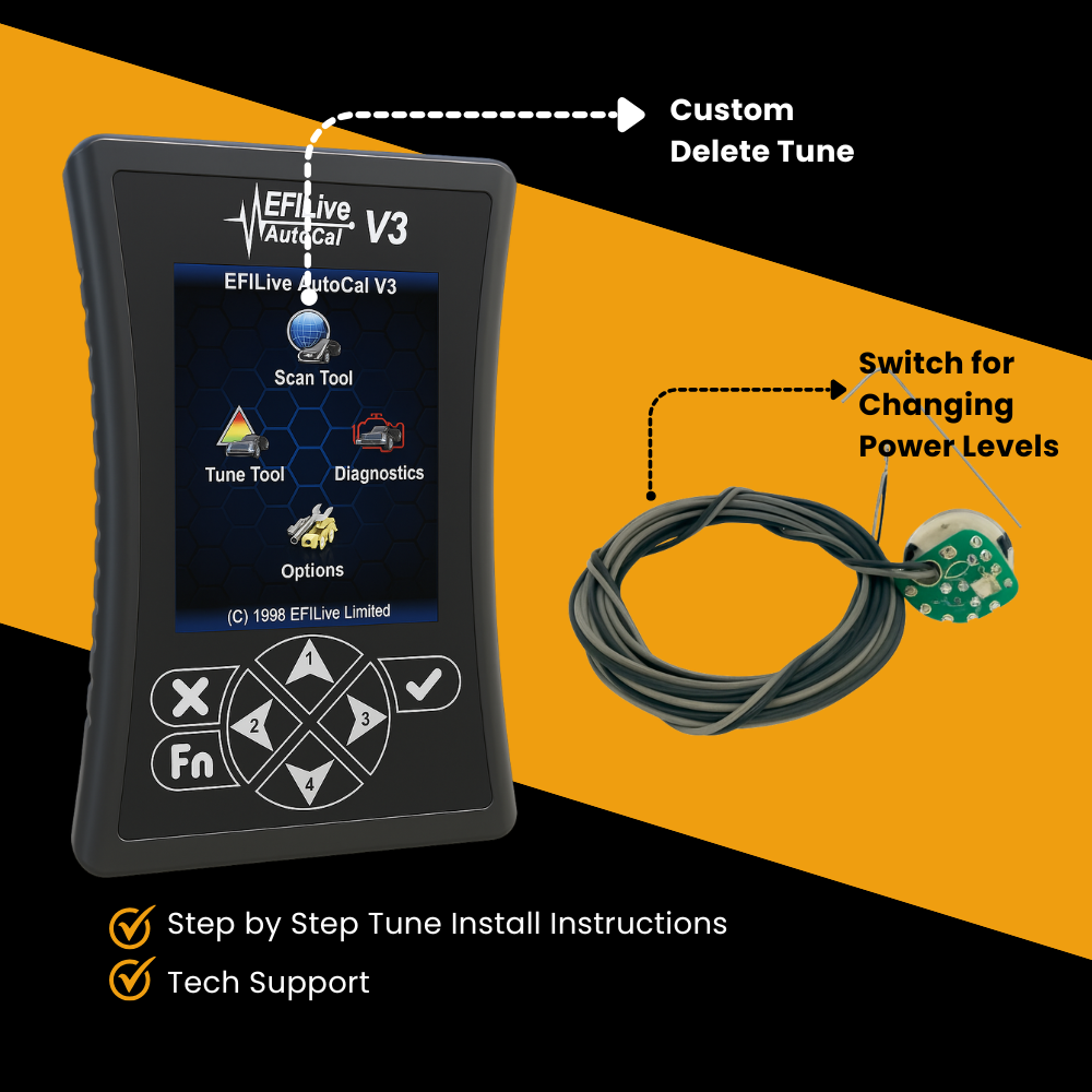 1) EFI Live Tuner and Delete Tune Software (not-preloaded) and all required accessories. Rotary switch to change power levels