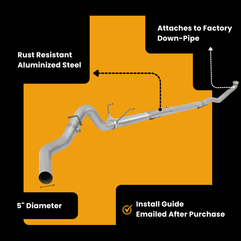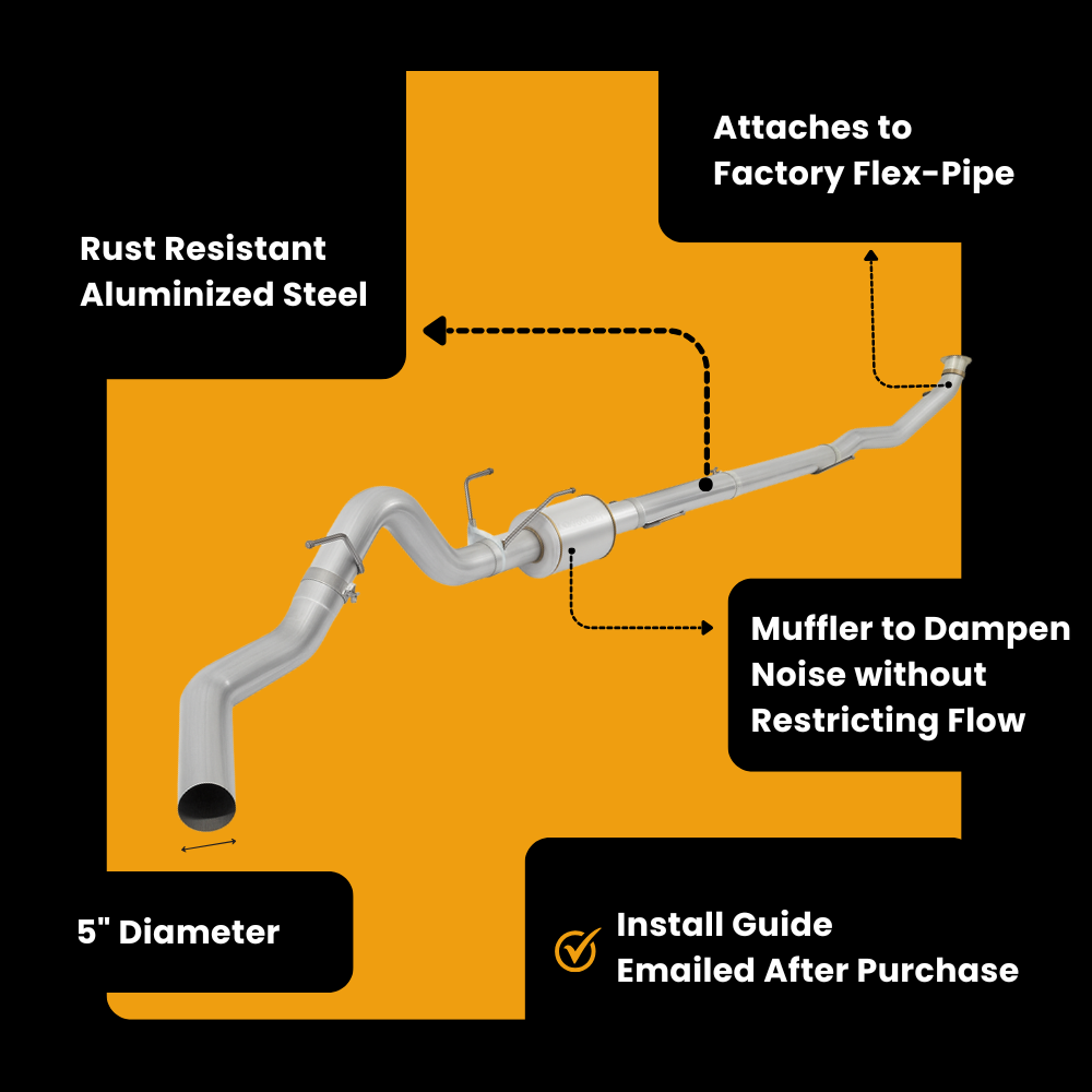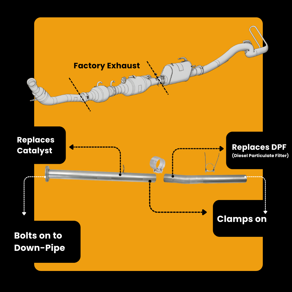 Our kit includes a DPF/CAT delete pipe that bolts in place of the original DPF and CAT in the exhaust system.